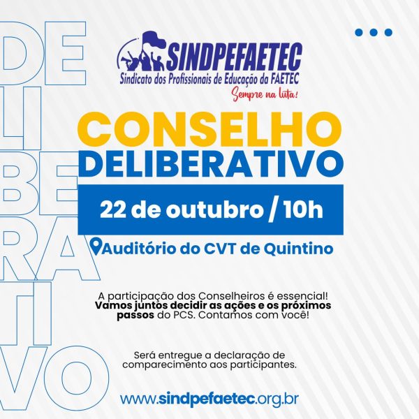 O SINDPEFAETEC convoca o Conselho Deliberativo para a reunião que ocorrerá no dia 22 de outubro no auditório do CVT de Quintino, às 10h da manhã.